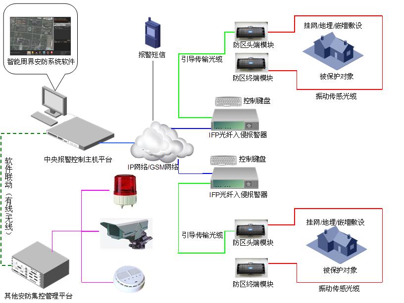 “智能光纖周界安防系統”是一套對威脅公眾安全的突發事件進行監控并實時產生警報的現代防御設備。它采用普通的通信光纜作為感應單元和信號傳輸介質,對前端防區進行探測,光纜以掛網和地埋等多種方式安裝在需要布防的位置,入侵者攀爬和闖入所引起的振動會改變傳輸光的模式,系統經過信號分析處理能準確的判斷是否有入侵發生,從而發出報警信號,當系統集中管理時,報警信號通過因特網或局域網將報警信號傳輸到接警中心服務器,通過報警軟件對信號進行分析處理,最終確定是否需存在警情,電子地圖可準確顯示入侵位置。